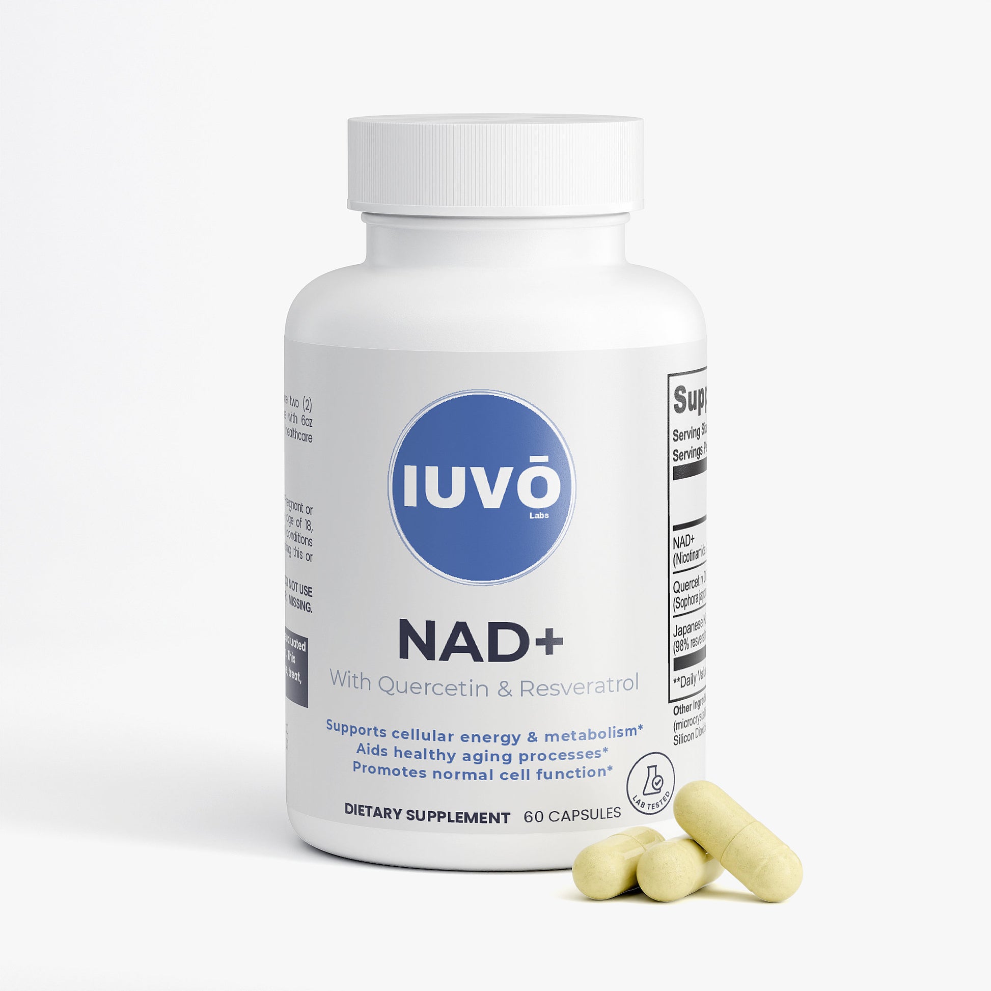 Ingredients: NAD+ (Nicotinamide Adenine Dinucleotide) (500 mg), Quercetin Dihydrate Extract (Sophora japonica) (whole flower bud) (250 mg), Japanese Knotweed Extract (98% Resveratrol) (Polygonum cuspidatum) (root) (150 mg), HPMC (vegetable capsule), Microcrystalline Cellulose (MCC), Brown Rice Flour, Olive Oil, Silicon Dioxide, Magnesium Stearate.